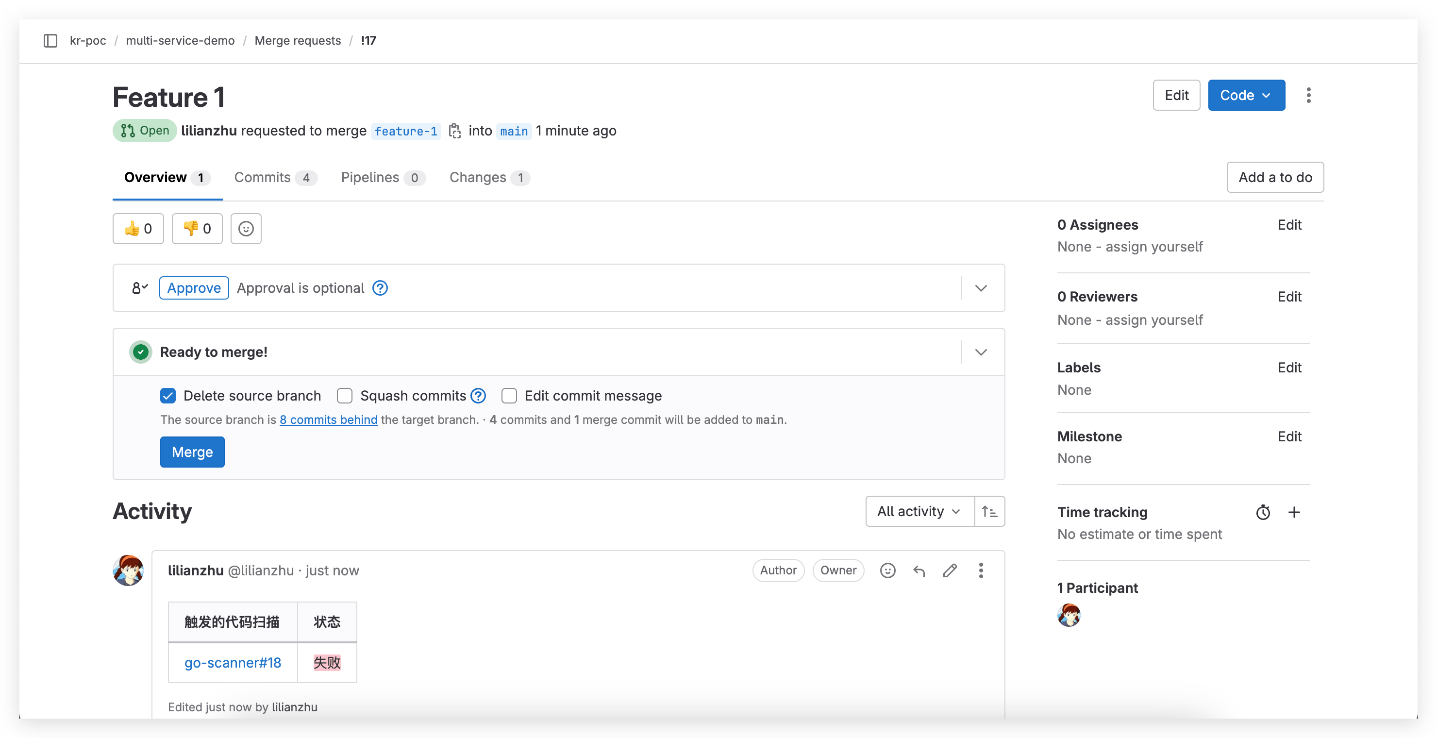 代码实现完毕提交代码变更 PR 后,会自动触发静态代码扫描执行。扫描结果会反馈在 PR 中,点击可跳转 Zadig 查看失败原因,在开发源头有效规避代码中的质量隐患、安全隐患。