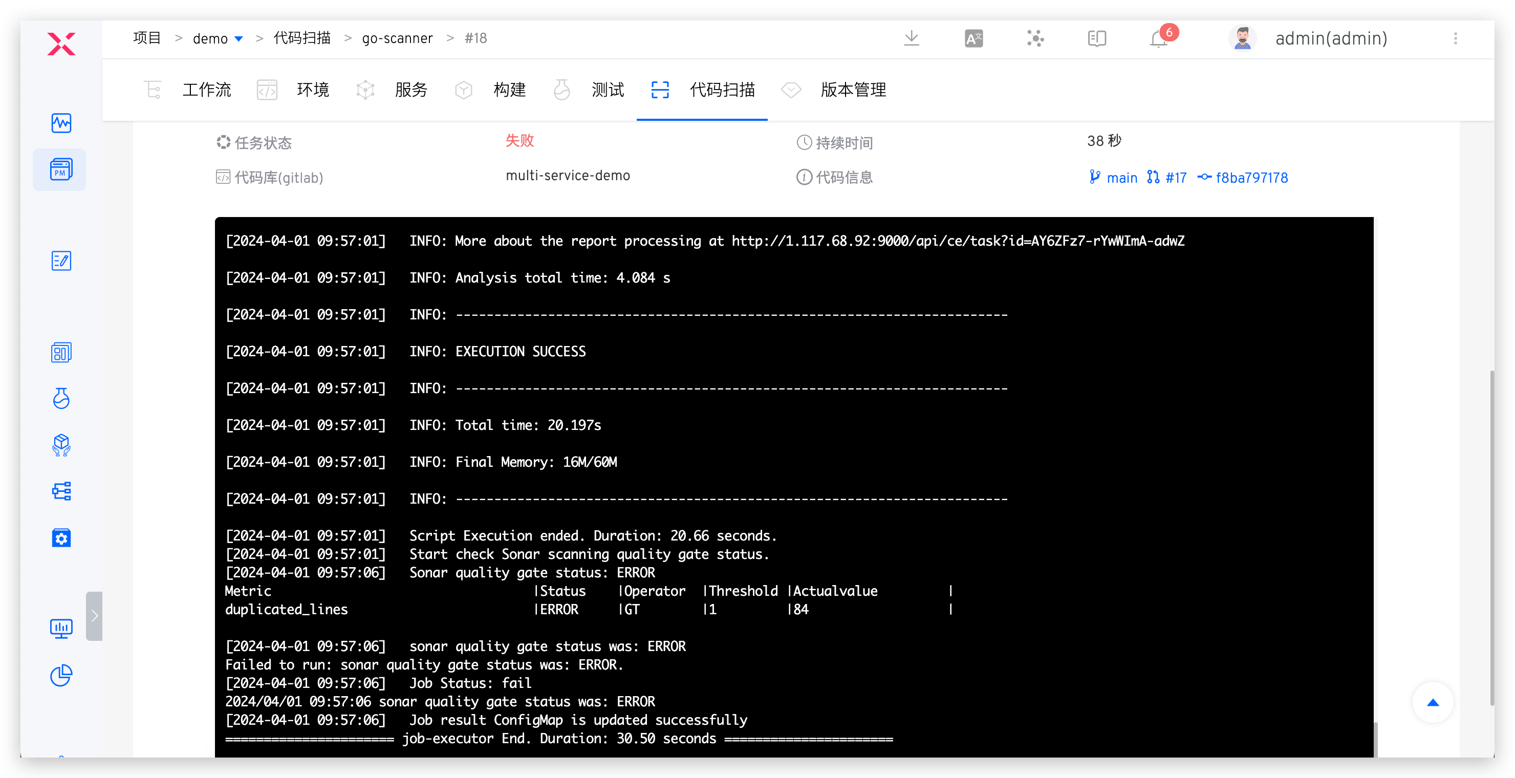 如果静态扫描任务执行失败,将会阻止后续的构建和部署任务运行。未通过验收的代码变更将被拒绝合并,以便从源代码层面捕获安全隐患,并建立有效的质量门禁措施。这种做法可以防止潜在问题进入到系统中。