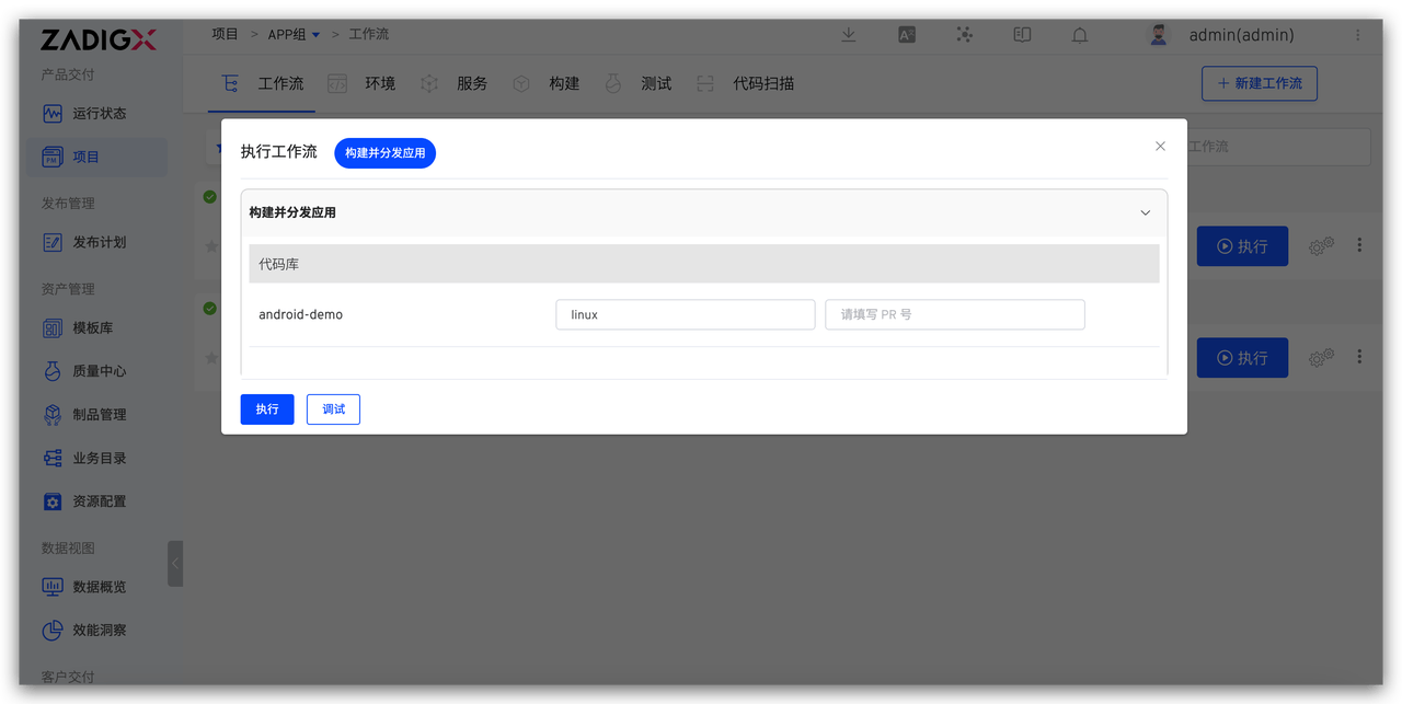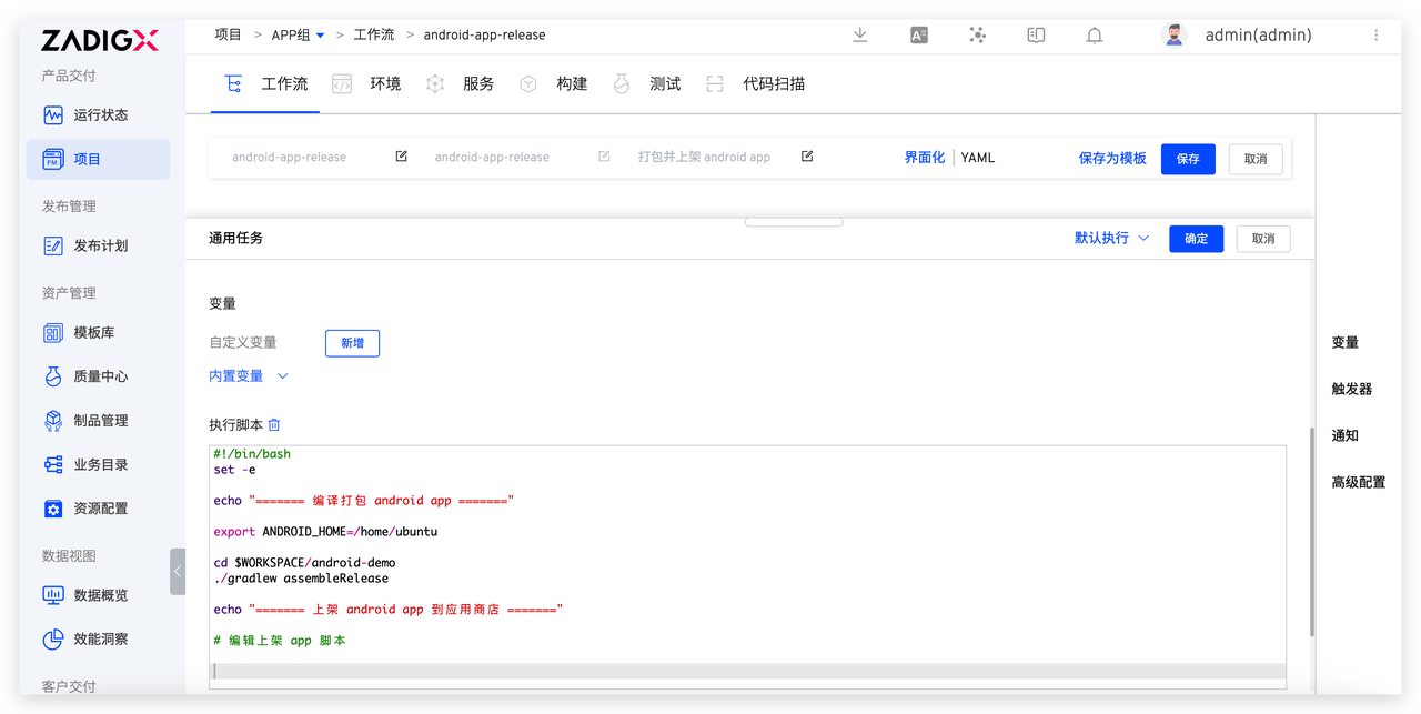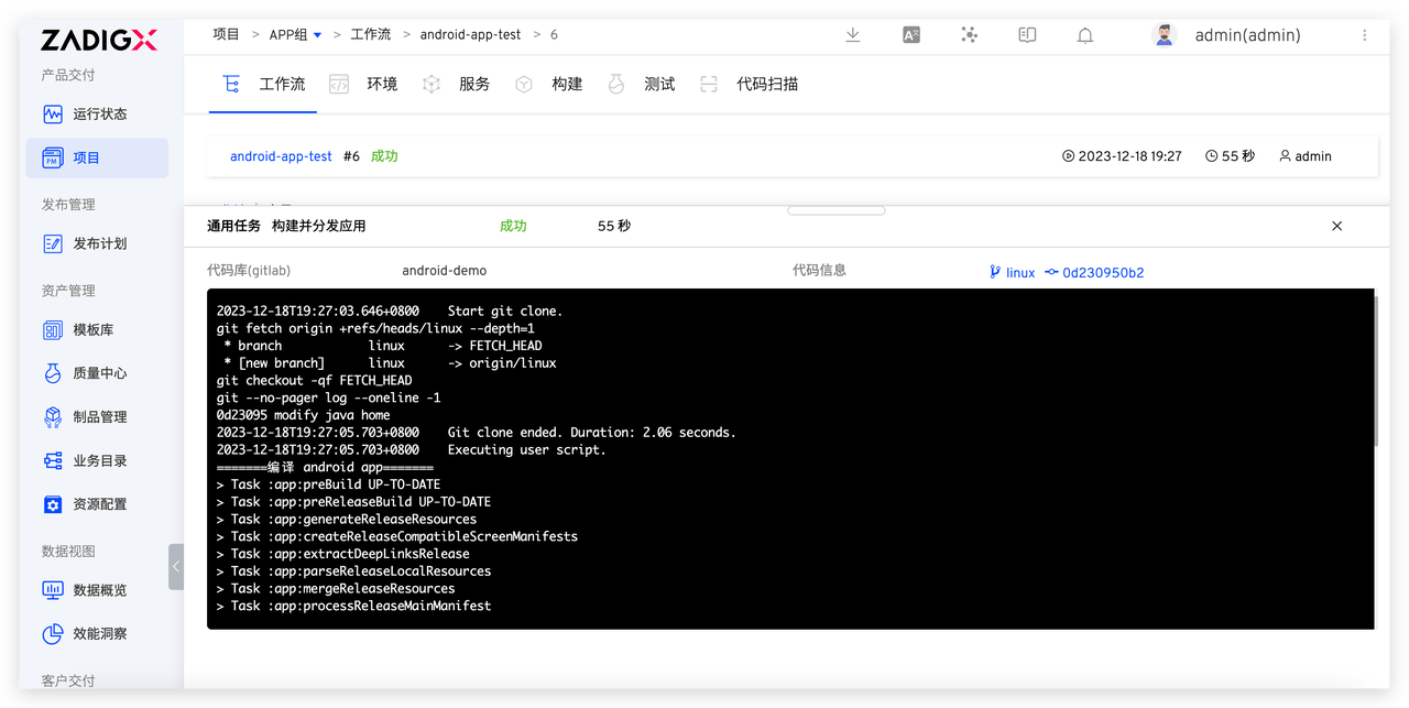 执行工作流选择代码信息,完成 Android App 自动化发布过程。