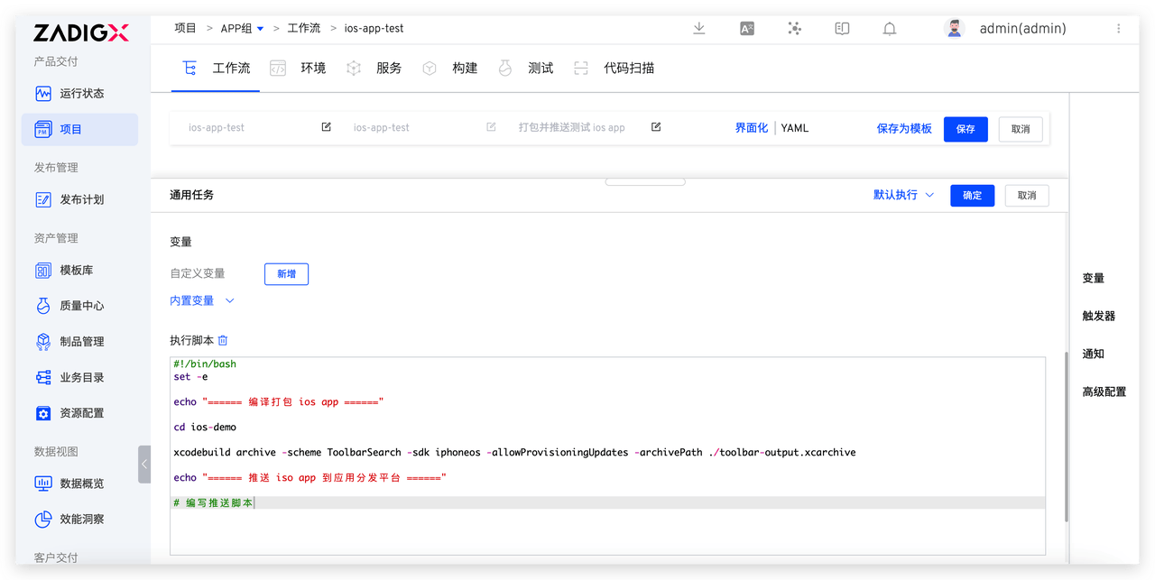 - 测试阶段:包括编译打包 iOS App 和推送 App 到应用分发平台步骤