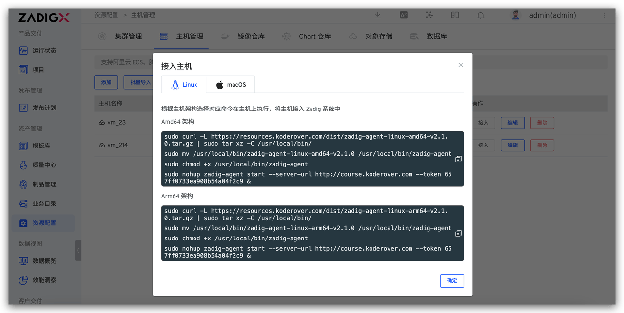 第二步:在主机上安装 Zadig Agent。根据主机的实际系统和架构选择对应命令在主机上执行。此处我们集成了两台主机(标签分别为linux 和 mac)分别用于后续 Android App 和 iOS App 的构建发布。