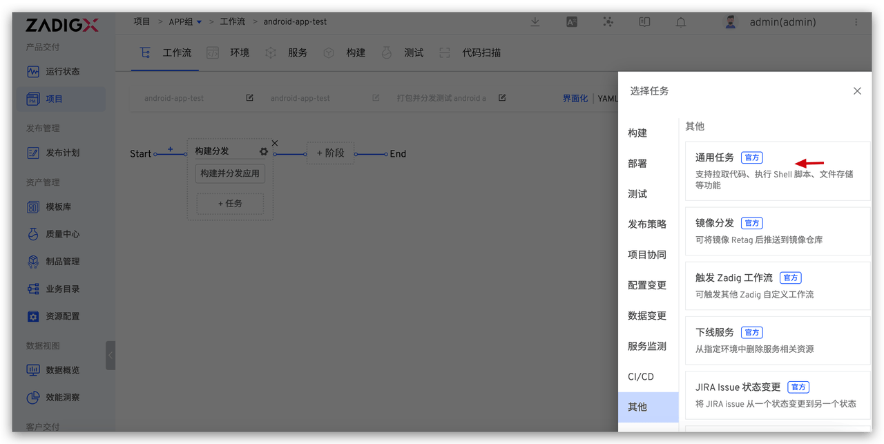 第一步:新建工作流 > 添加「阶段」> 添加「任务」,选择「通用任务」