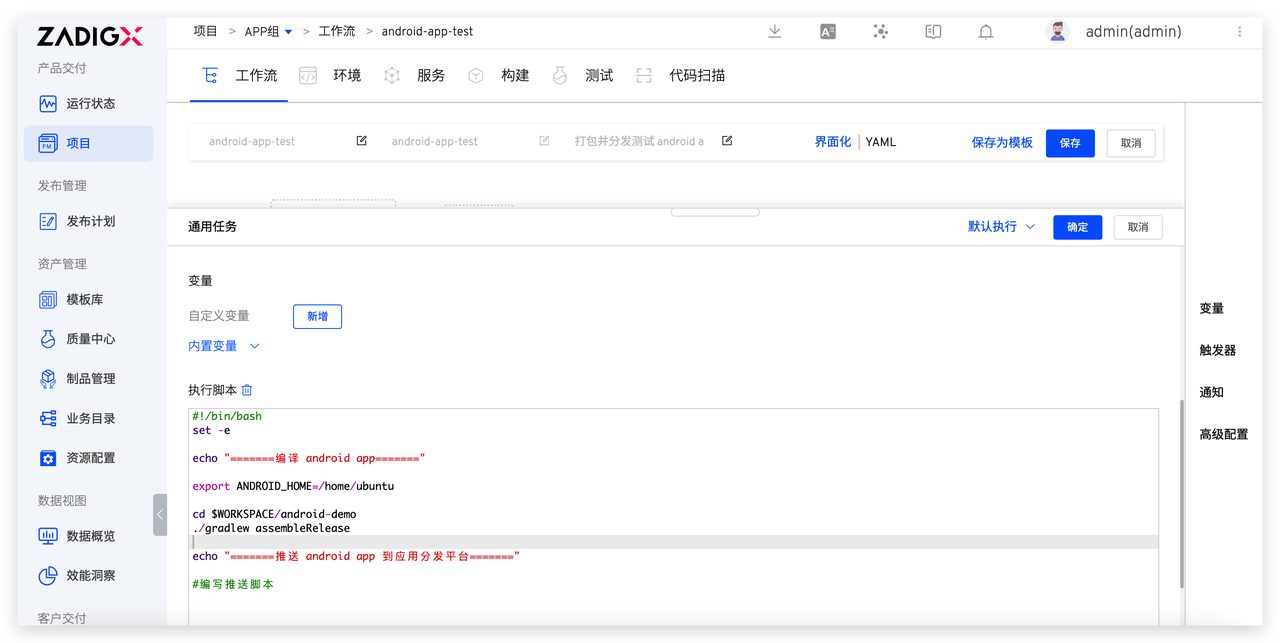 - 测试阶段:包括编译打包 Android App 和推送 App 到应用分发平台步骤